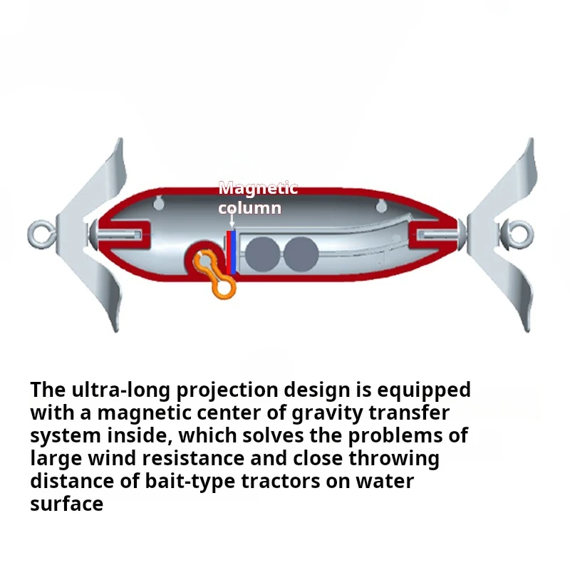 Outro ponto forte desta amostra é o sistema de transferência magnética de massas, que ajuda a melhorar a distância de lançamento e a estabilidade em voo. O conjunto fica assim mais eficaz em zonas abertas, margens largas ou situações em que seja preciso cobrir bastante água. Pelo formato e pelo trabalho de superfície, enquadra-se muito bem na pesca de predadores com artificiais.