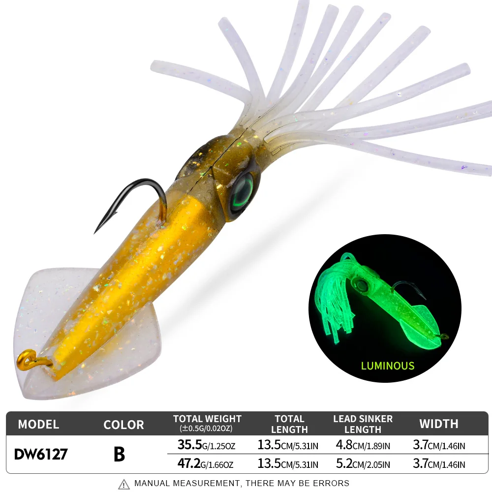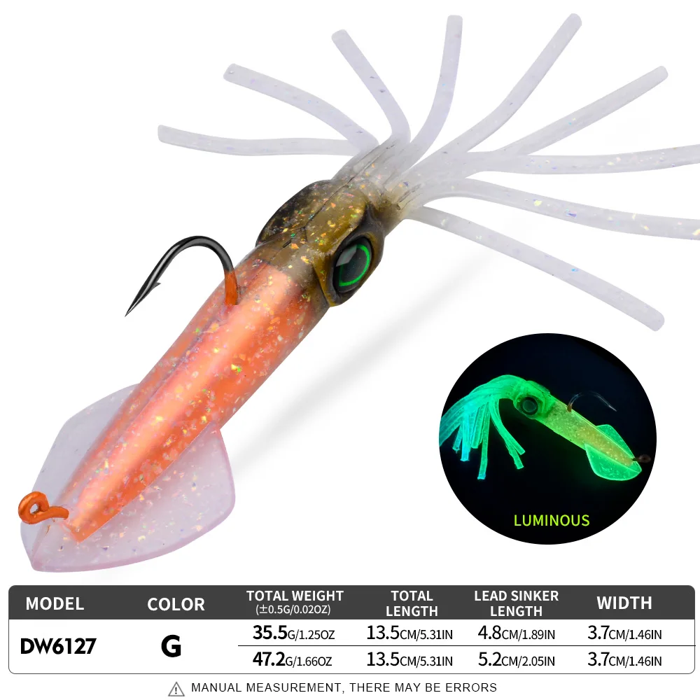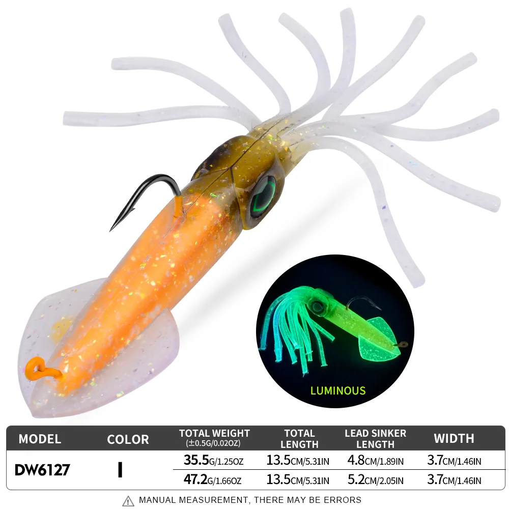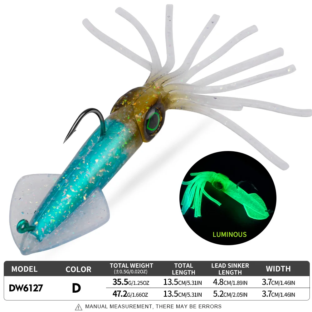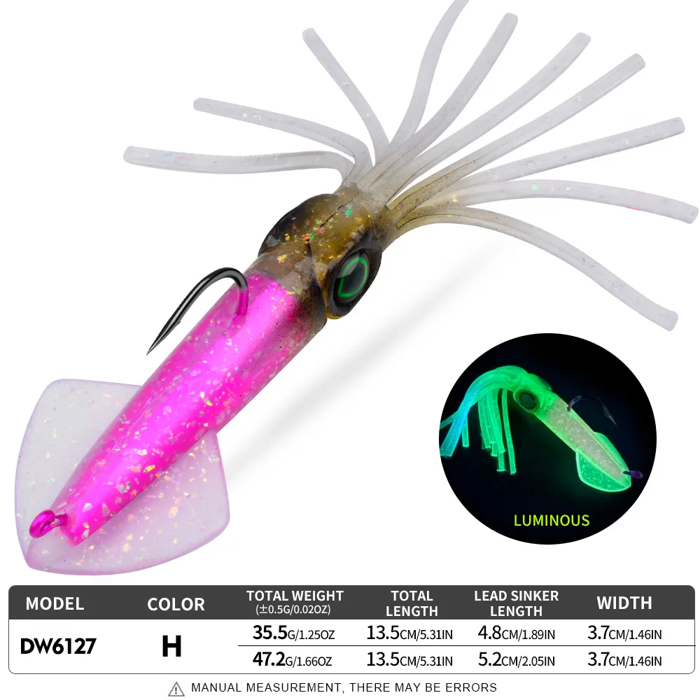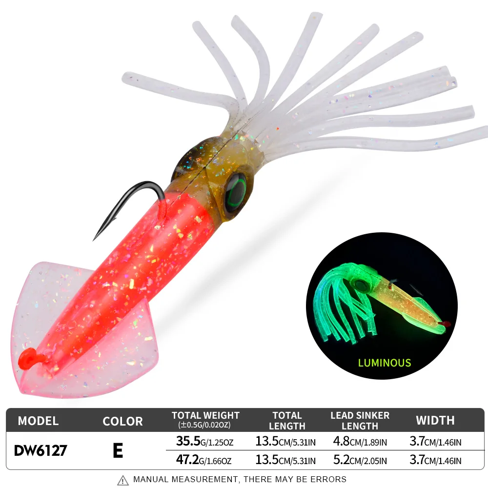 A Proberos tipo lula é uma amostra de vinil montada com cabeça plumbada e anzol, concebida para apresentar um perfil apelativo e um nado fluido em pesca activa. O corpo macio em forma de lula, aliado ao acabamento luminescente, torna esta amostra especialmente interessante em situações de menor luz, maior profundidade ou água mais turva, onde a visibilidade extra pode fazer diferença.