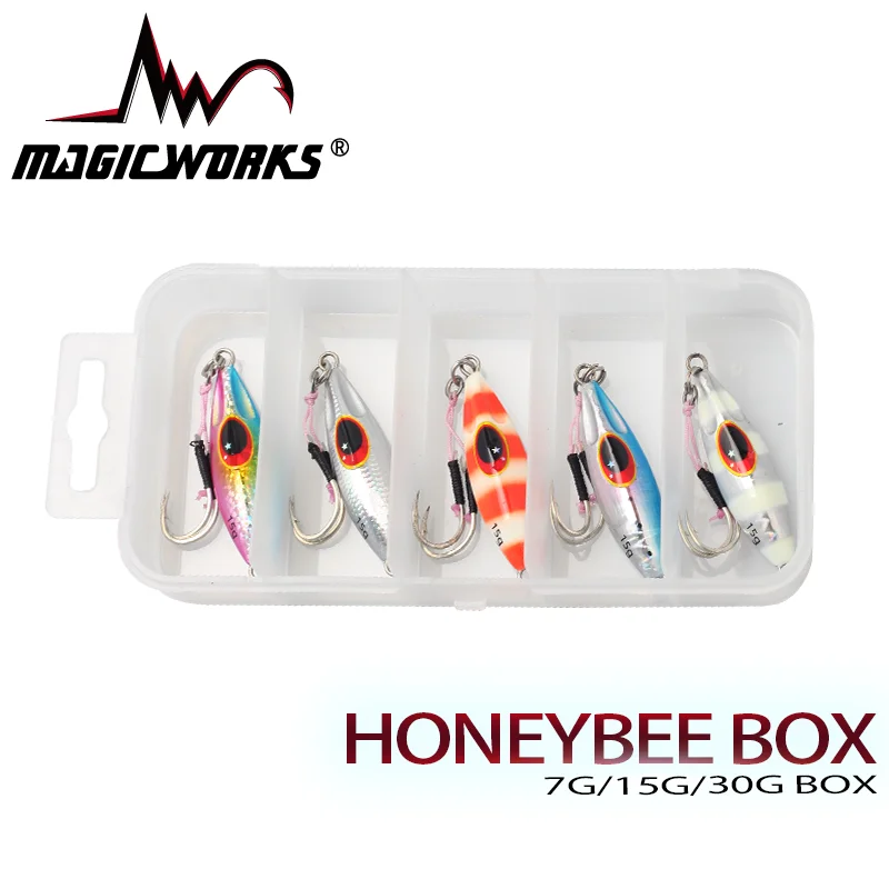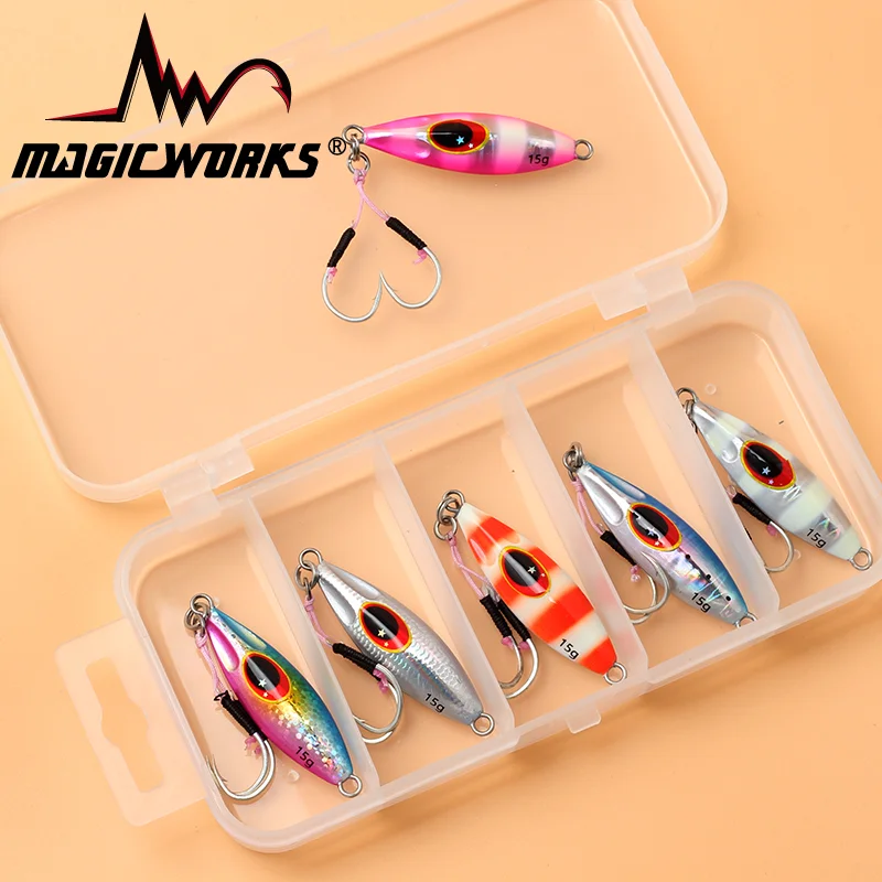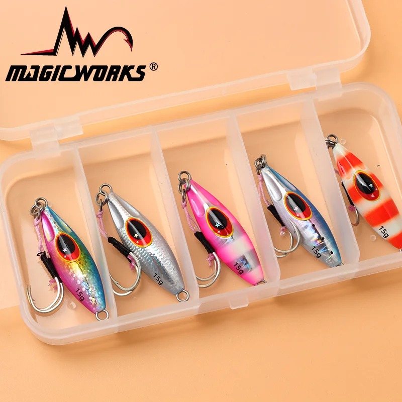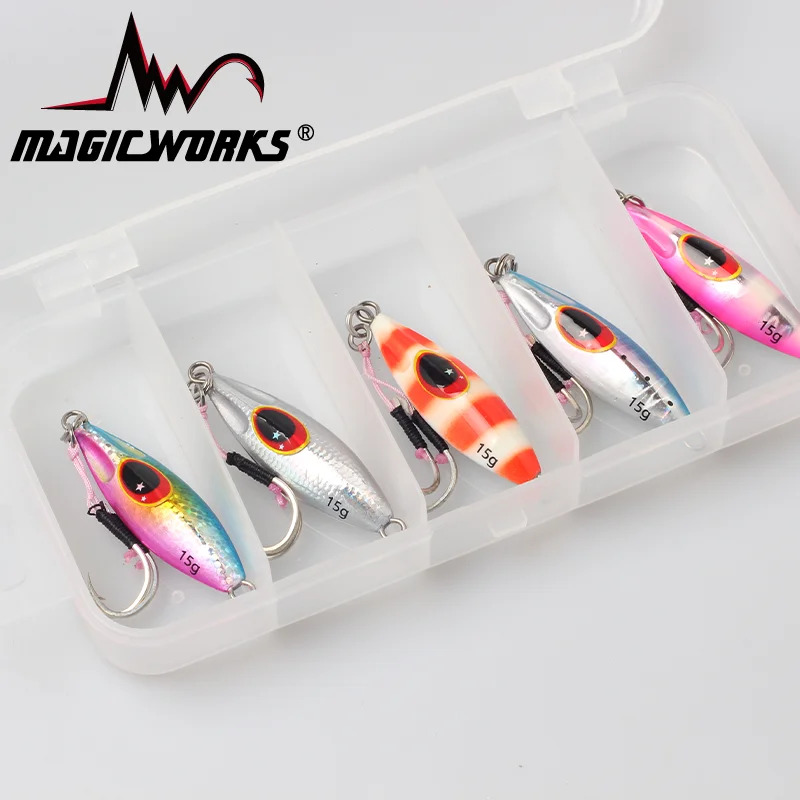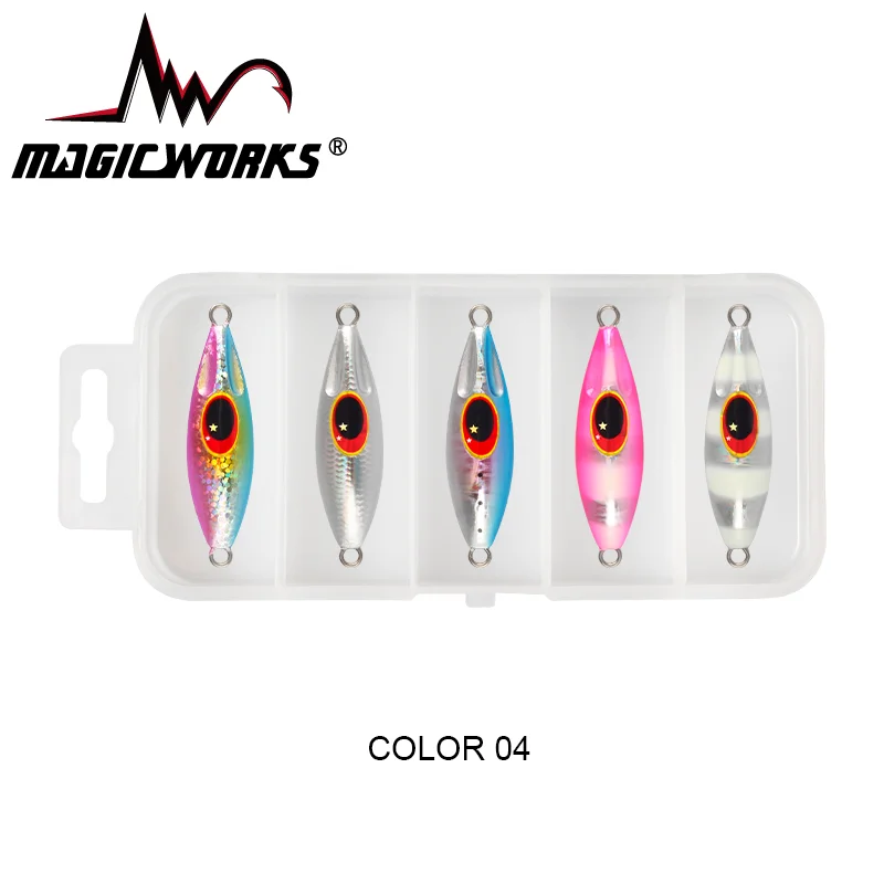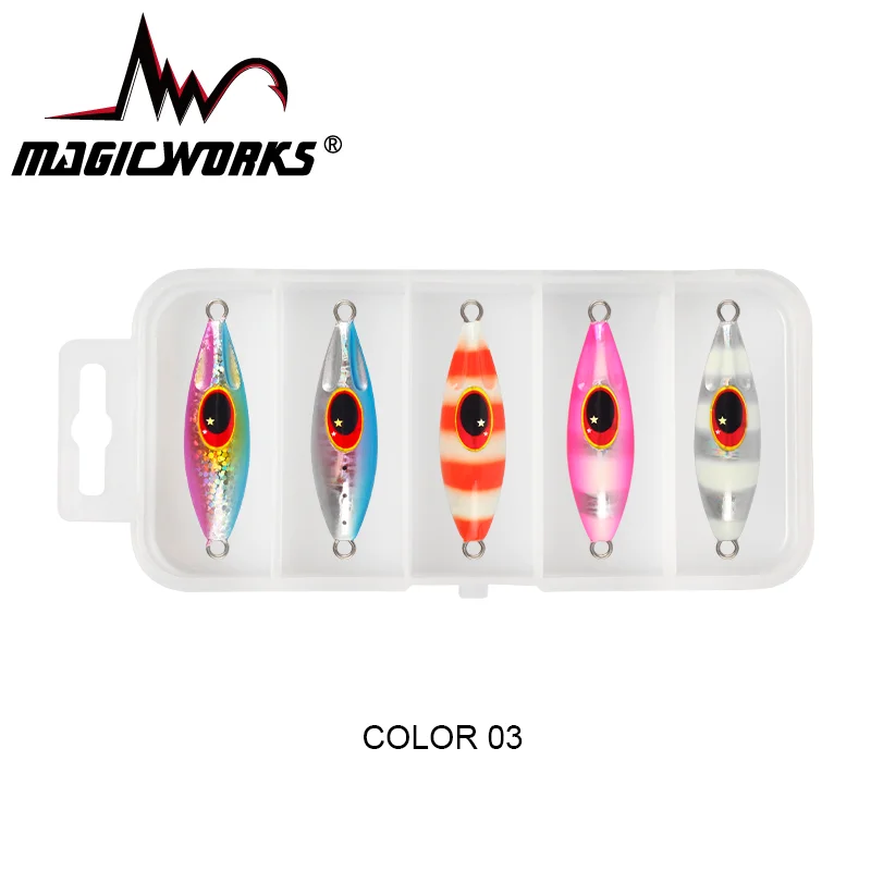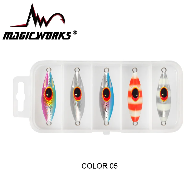 O conjunto de jigs metálicos Magic Works foi concebido para pescadores que procuram amostras compactas e versáteis para trabalho em coluna de água, fundos ligeiros e zonas com peixe activo. Pela combinação de peso, formato e montagem com anzóis de jigging, enquadra-se sobretudo em slow jigging ligeiro e em outras pescas com metal onde seja importante ter uma descida controlada e uma apresentação apelativa.