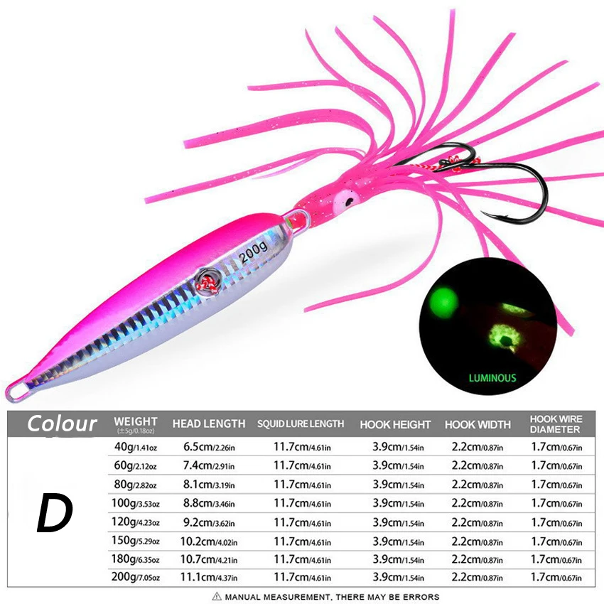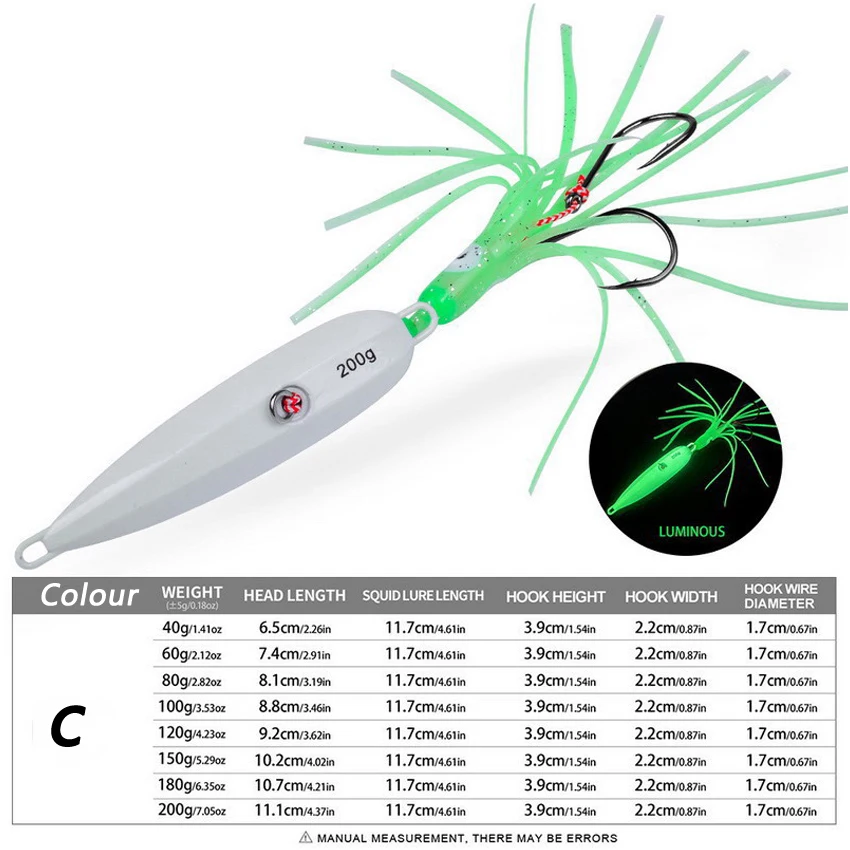 Disponível entre 40 g e 200 g, adapta-se a diferentes profundidades e condições de deriva, permitindo escolher o peso mais adequado ao cenário de pesca. Os olhos luminescentes e o acabamento glow reforçam a visibilidade da amostra, o que pode ser uma mais-valia em maior profundidade, fundos escuros ou períodos de menor luz. É uma solução prática para quem quer uma montagem eficaz e pronta a usar.