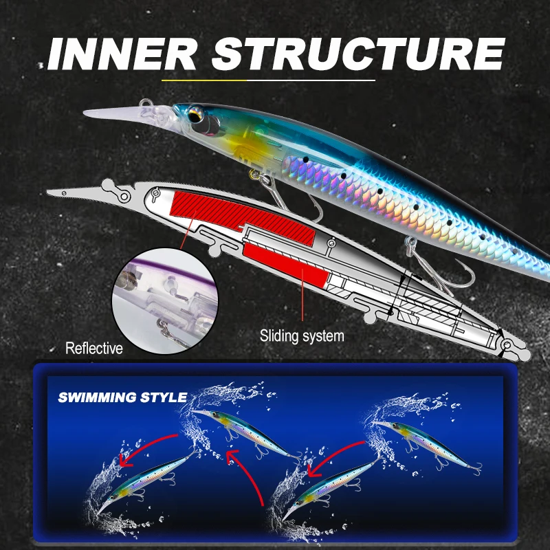 O sistema interno de massas deslizantes ajuda no lançamento e contribui para uma apresentação mais eficaz em zonas abertas, com vento, corrente ou necessidade de cobrir mais terreno. A informação de origem é algo inconsistente quanto à flutuabilidade exacta, por isso o mais correcto é enquadrá-lo como uma amostra de trabalho lento, adequada a recolhas contínuas, twitchs, jerkadas e pausas controladas, tanto em água doce como no mar.