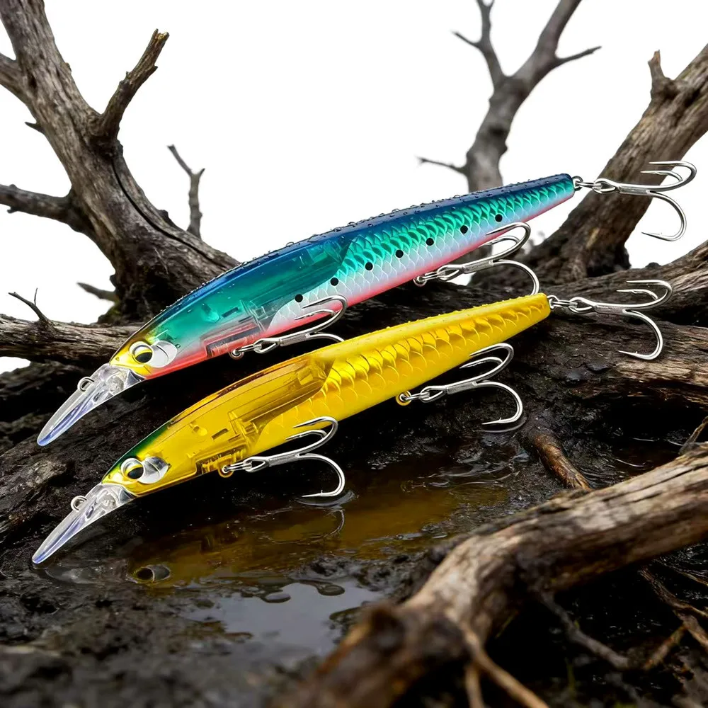 Esta amostra faz muito sentido para pesca ao robalo, lúcio, achigã e lucioperca, sobretudo em estuários, barragens, canais, margens de pedra, zonas de costa e locais com alguma profundidade próxima. O seu peso permite lançar bem e manter maior controlo com vento ou corrente, enquanto o perfil alongado favorece ataques de predadores que caçam presas maiores. A flash blade pode ser uma mais-valia em dias de sol, água com alguma transparência ou situações em que o brilho ajude a chamar peixe à distância. Pode ser usada a partir de terra ou em embarcada ligeira, com recolha contínua, twitchs, jerkadas e pausas.