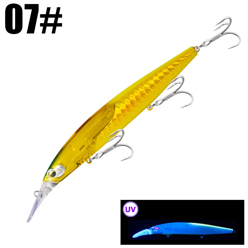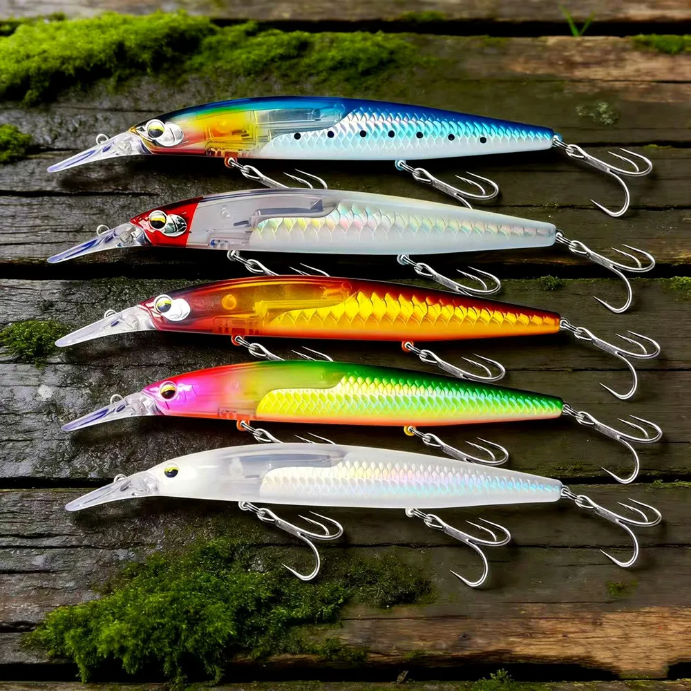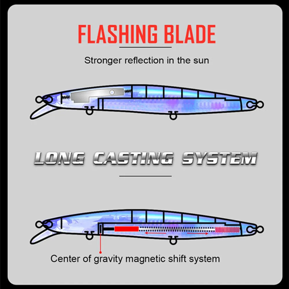 Um dos pontos mais importantes desta amostra é o sistema magnético de deslocação do centro de gravidade, pensado para melhorar o lançamento e estabilizar melhor o comportamento em voo. A isso junta-se a presença de uma flash blade interna, que reforça o reflexo e o brilho da amostra sob a luz, acrescentando um estímulo visual importante durante a recuperação. É uma configuração muito interessante para predadores que respondem bem a perfis alongados, reflexo e presença marcada em meia água.