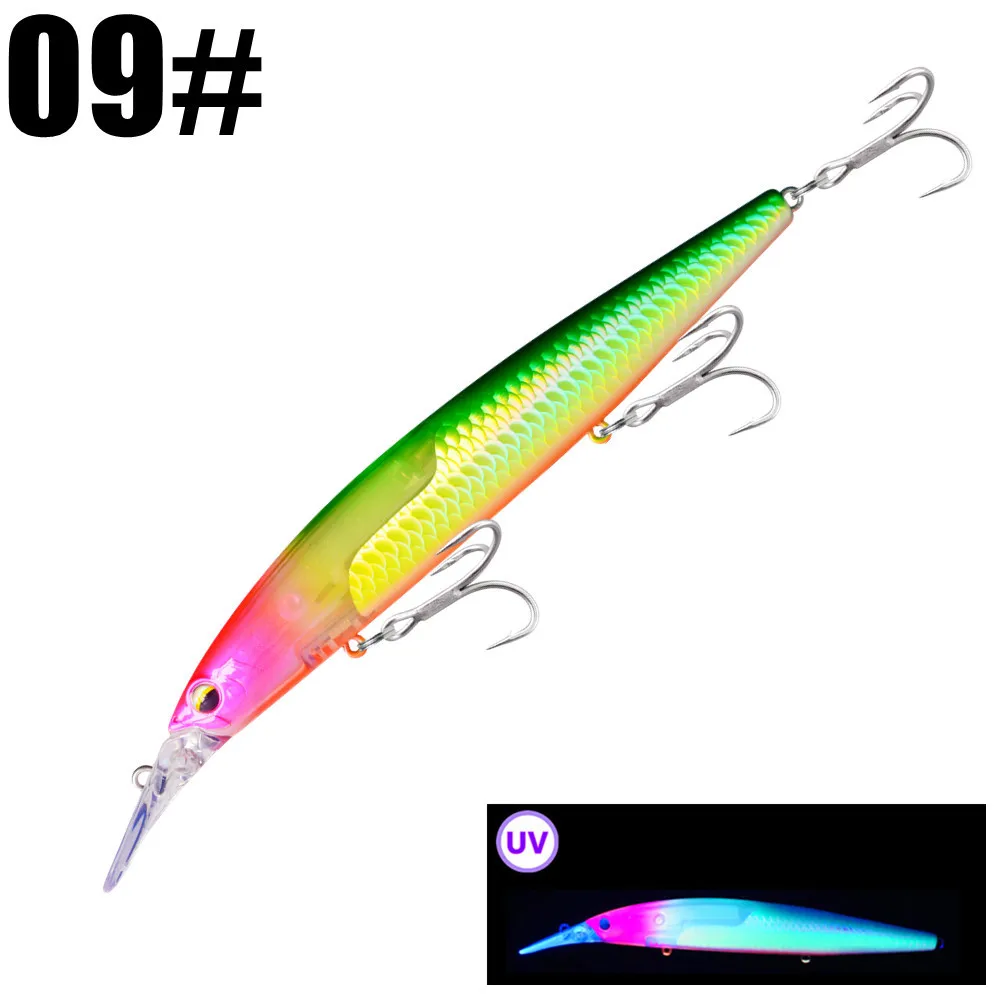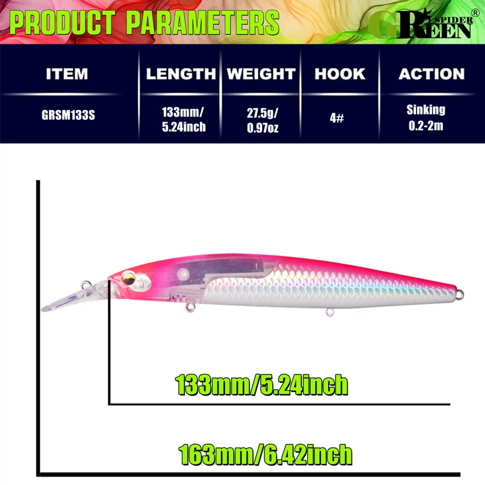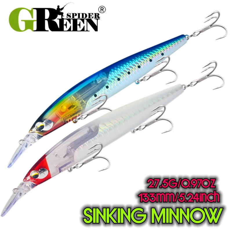 O Greenspider 133 mm 27,5 g é uma amostra rígida do tipo Minnow Long Cast, desenvolvida para pescas em que a distância de lançamento, a estabilidade e o poder de atracção visual fazem verdadeira diferença. O corpo alongado e o peso elevado para a sua classe tornam-no particularmente útil em zonas abertas, com vento, corrente ou necessidade de cobrir bastante água com eficiência.