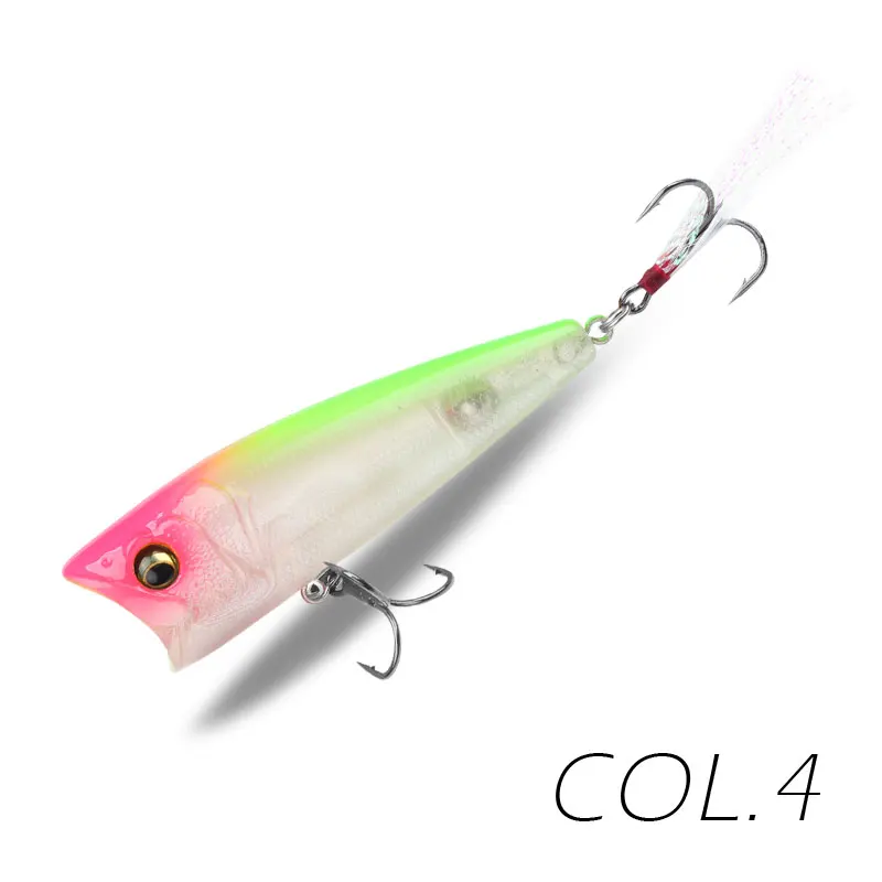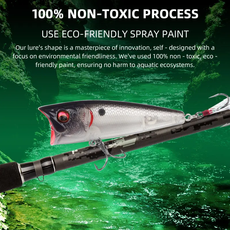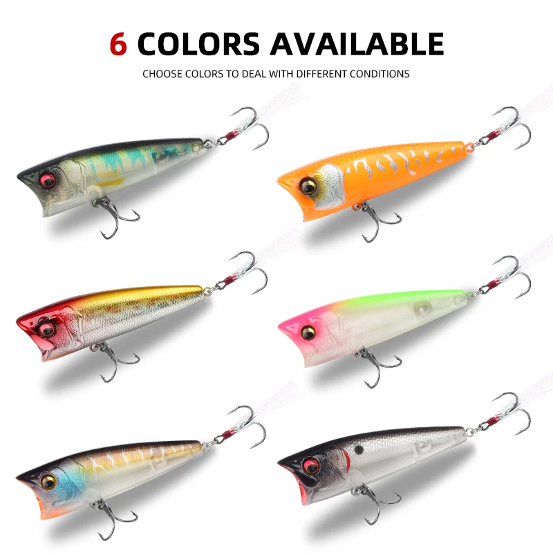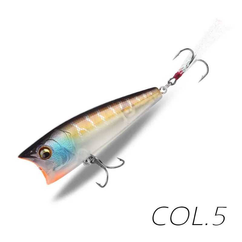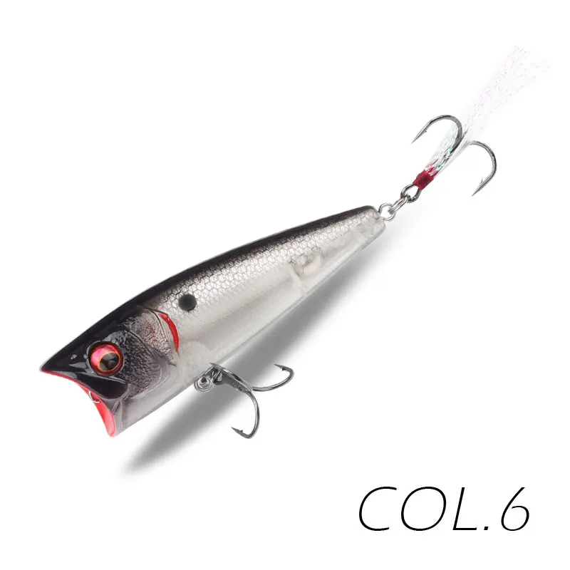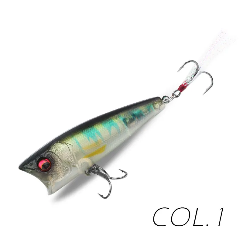Este popper faz mais sentido em pesca à tona ao achigã, perca e lúcio, sobretudo em zonas de pouca profundidade, margens com cobertura, entradas de água, estruturas e momentos em que o peixe anda a caçar perto da superfície. Pode ser trabalhado com pequenos toques de ponta de cana, pausas curtas e recolhas irregulares para criar salpicos e ruído apelativo. Também pode resultar ao robalo em spinning ligeiro no mar, especialmente em águas mais calmas, primeira luz, fim de tarde ou em situações de peixe a caçar na tona. É uma amostra indicada para quem gosta de ataques visuais e pesca mais reactiva.
